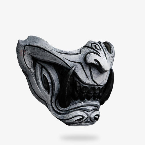 Veste haori kimono noir pour homme à la silhouette minimaliste et fluide, idéale pour un look japonais raffiné et discret. L'homme porte un masque hannya blanc.